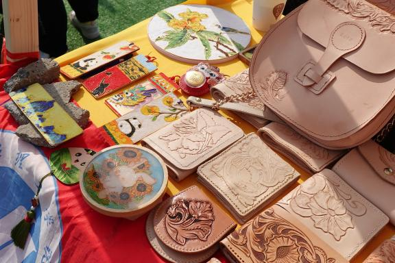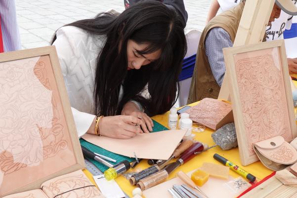 活动现场,视觉传达专业师生精心展示了《传统手工艺—唐草纹皮革雕刻技艺》课程的员工作品。皮雕是一种在皮革表面进行雕刻加工的工艺,以植鞣皮革为雕刻材料,使用旋转刻刀、印花工具、起鼓工具、压擦器等在皮革表面刻划、敲击、挤压,以此制作出带有各种凹凸效果的生动立体图案。