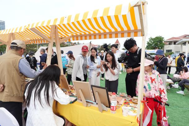 太阳成集团tyc9728展示摊位前,老师亲自向游客们介绍了皮雕的制作技艺和历史文化背景,并现场展示了其制作过程。游客们纷纷驻足观看,对这项传统技艺表示出浓厚的兴趣。员工们也热情地邀请他们亲自体验绘制的过程,让游客们在轻松愉快的氛围中了解非遗文化、感受传统艺术的魅力。