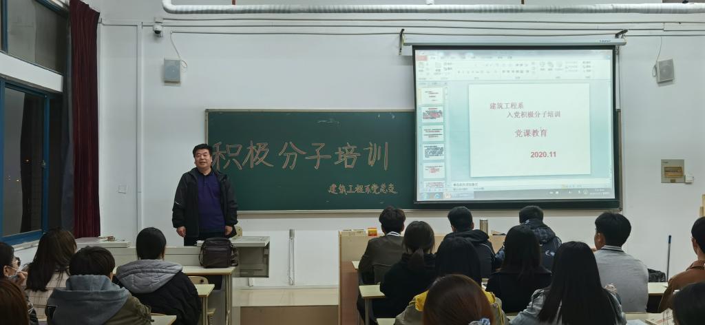 按照建筑工程系入党积极分子培训班系列理论培训的开展,为进一步加强入党积极分子基本理论知识系统教育,提高入党积极分子的理论水平,切实保证新发展党员质量,建筑工程系党总支书记裴书生老师于11月12日晚在一号教学楼210开展我系第三期积极分子培训。