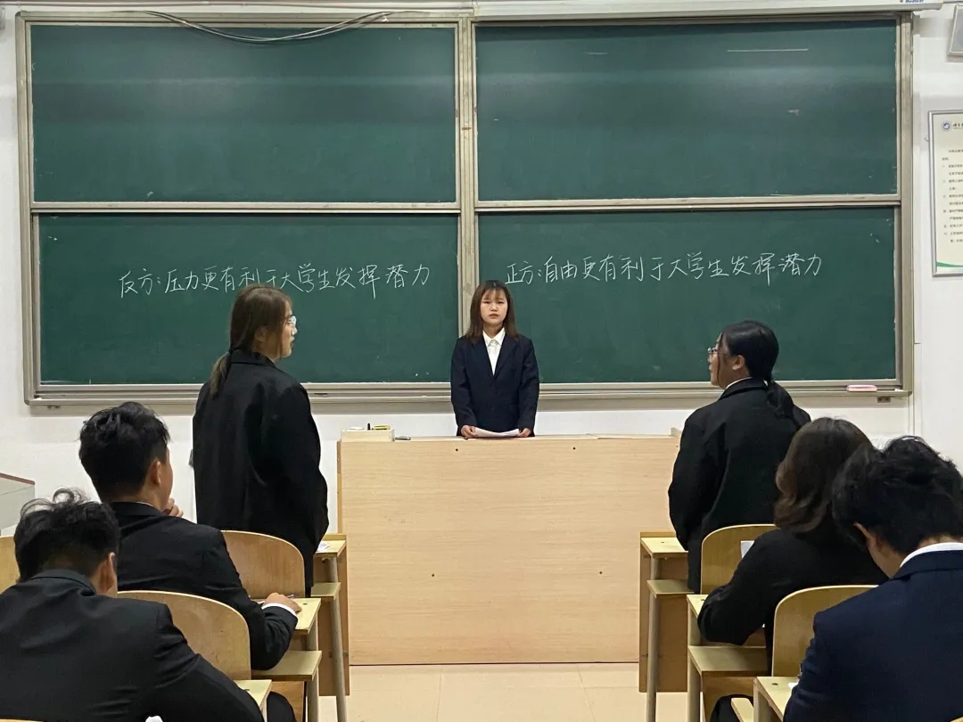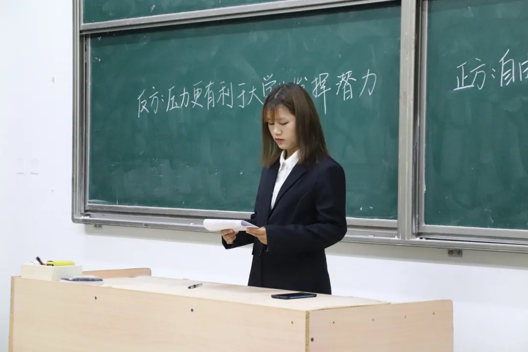 比赛继续进行,进入自由辩环节。赛场气氛紧张激烈,双方辩手针锋相对,唇枪舌剑,你来我往,却又不失风度。良好的风范,出色的口才,敏捷的思维令场下观众折服,掌声不断。最后比赛进入最后的总结陈词环节,正反双方辩手清晰的思路和巧妙的陈词给评委观众留下了深刻的印象。