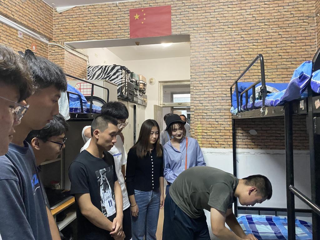 在走访过程中,各位班主任细心询问新生步入大学的感受,提醒同学们尽快调整心态,表示在寝室生活中,同学们要求同存异,创造良好的寝室氛围。并提醒同学们疫情当下,一定要注意宿舍卫生和宿舍通风问题,打造寝室整洁和舒适的生活环境。军训期间,注意内务整理问题,不得使用违规电器,消除安全隐患,加强安全工作,养成良好生活习惯。