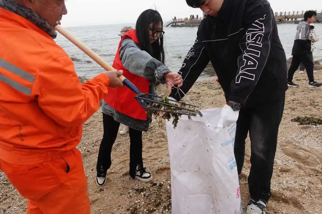 授旗完毕后,同学们身着统一服装,手拿环保袋、夹子等工具,穿梭在海边,分组进行海边的垃圾、烟头以及废弃渔具的卫生清洁,并对垃圾进行分类和回收。同学们四处奔波,尽情挥洒青春的活力。
