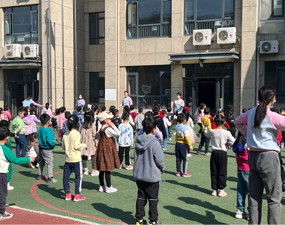 在大课间时间,志愿者们和小朋友们一同来到了操场,天气晴朗、阳光照向大地、志愿者和小朋友们精神抖擞的做着操,弯弯腰、踢踢腿、蹦蹦跳跳,边喊着口令边做着操。