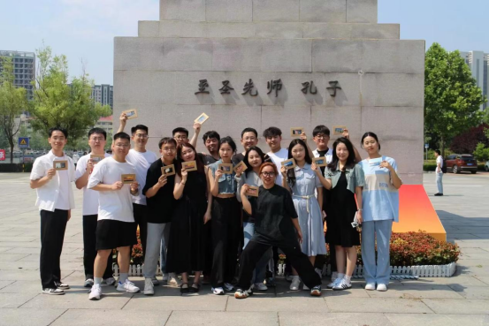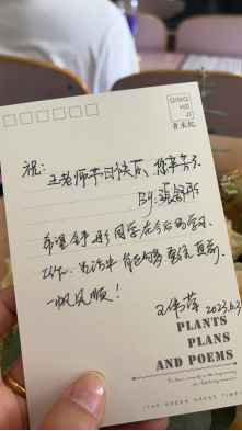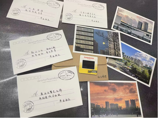 员工自制了校园风景的明信片,手持明信片在校园中留念拍照。