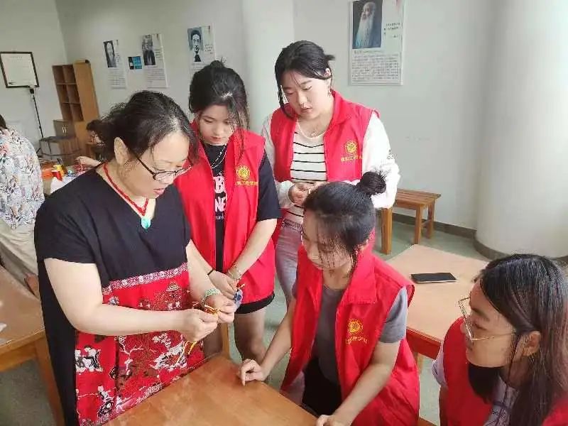 社会实践队的成员们跟随非遗艺人李媛媛老师的讲解,在烟台莱山文化馆学习了雀头结,千回结等结绳的编发。雀头结,用两线编织的绳结,雀头结在中国和西洋绳结里都有出现,纹理整齐美观,常寓意心情雀跃,喜上眉梢。一般用两线编织,技艺稍加变化,换用一卷细棉线用梭子编织,则成西洋古老的梭边蕾丝技法。
