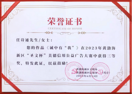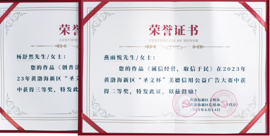 2023年6月14日,在黄渤海新区举办的“圣文杯”美德信用黄渤海新区公益广告大赛颁奖仪式上,建工学子取得二等奖1项、三等奖2项、优秀奖9项、网络人气奖10项的优异成绩,共获得奖金10500元。