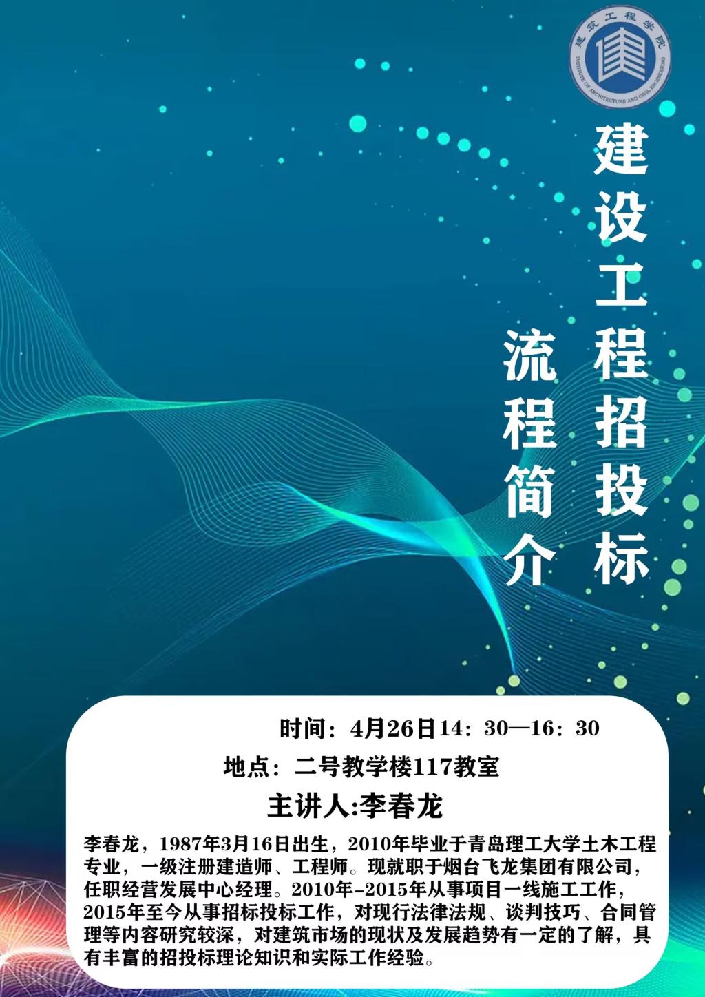 4月26日下午14:30在二教117教室,烟台飞龙集团有限公司经营发展中心经理李春龙应太阳成集团tyc9728的热烈邀请,召开工程管理专业毕业设计系列专题讲座之“建设工程招投标流程简介”。此次会议面向工程管理(本科)、工程管理(专升本)和建设工程管理等三个专业,共6个毕业班的员工以及工程管理专业教师,旨在进一步深化员工的专业知识,对所学专业的理论和实践能力有更深刻的认识,从而发挥在毕业设计及日后工作中的作用。