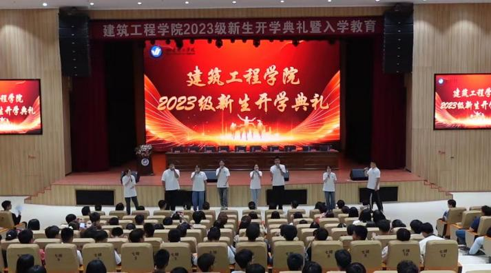 2023级新生开学典礼在欢快的《奔跑》中拉开序幕,随后全体起立奏唱国歌。