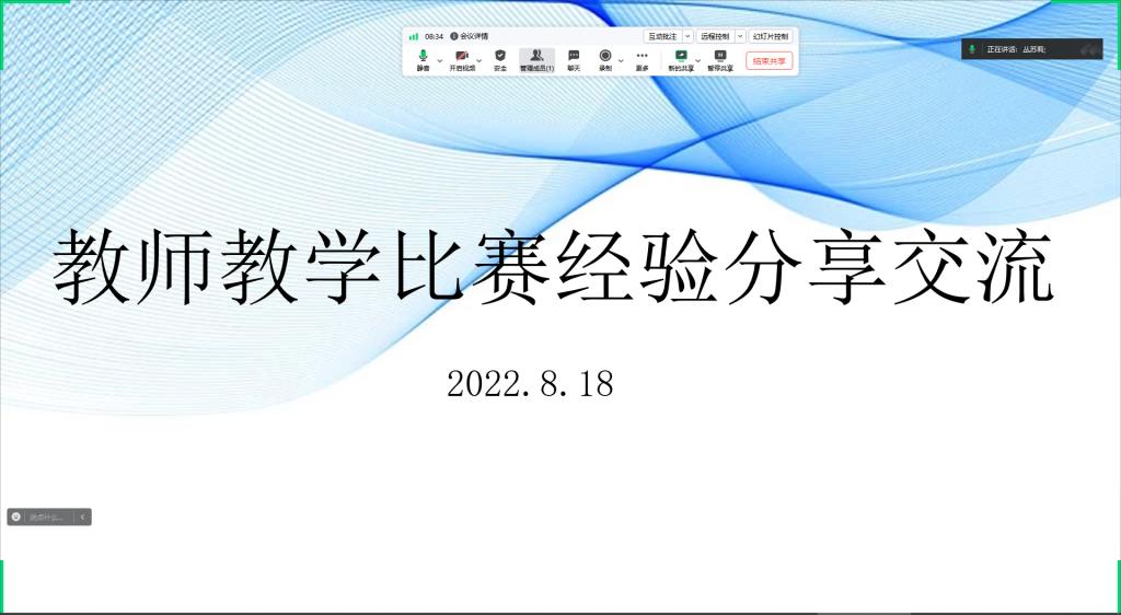 为激发工程管理专业教研室教师教学创新,探讨育人新途径,促进教学质量不断提高,同时进一步帮助教研室教师全面了解高校教师教学比赛,准确把握大赛要求,激发教师参赛热情,8月18日,教研室开展了“教师教学比赛经验分享交流”的研讨会。丛苏莉老师主持,教研室全体教师参与。