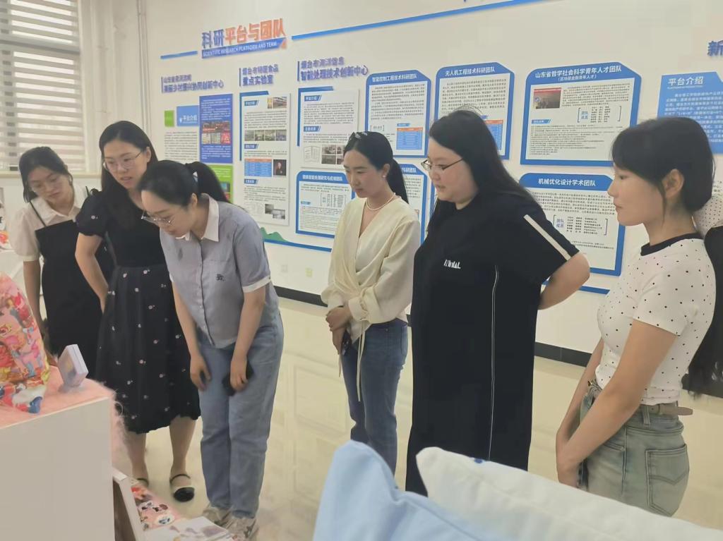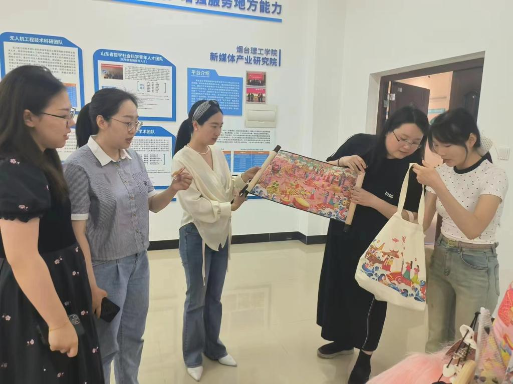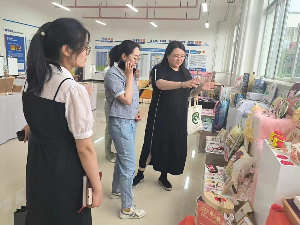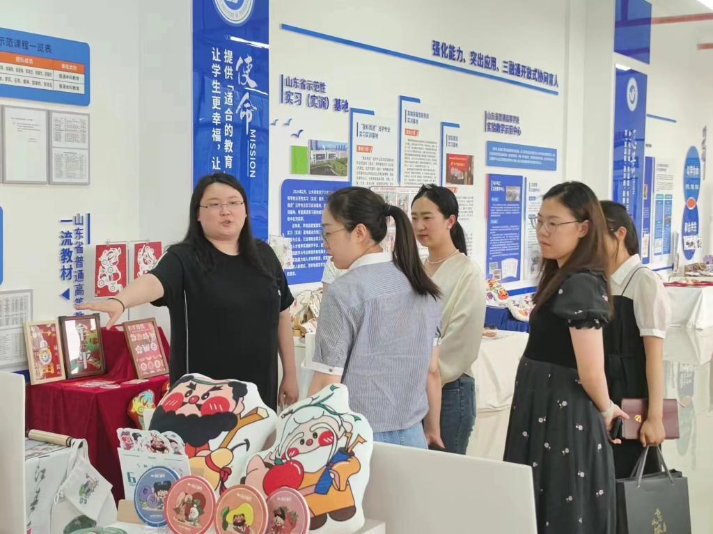 研讨会召开之前,太阳成集团tyc9728团队带领大季家街道办事处的领导们参观了独具特色的非遗毕业设计展览。该作品展集中展示了公司2024届视觉传达设计专业102名毕业生同学的精美作品,内容包括非遗文创、非遗品牌设计、非遗插画设计、非遗IP形象设计等多种创意表现形式。老师们热情地介绍每一件非遗文创作品的艺术理念、创作风格以及它们背后的非遗故事。根据当地特色,展示了烟台非遗文化的魅力。