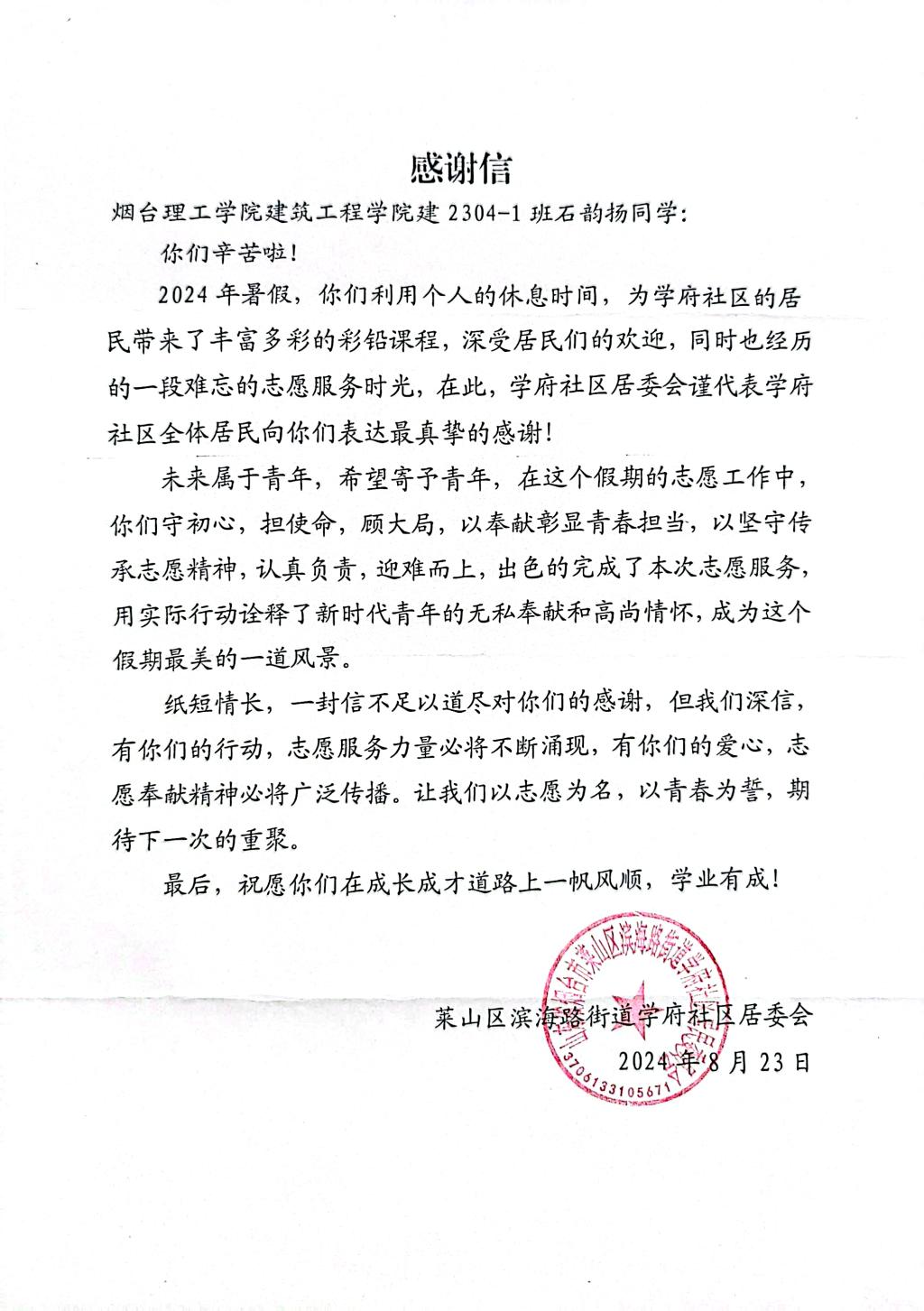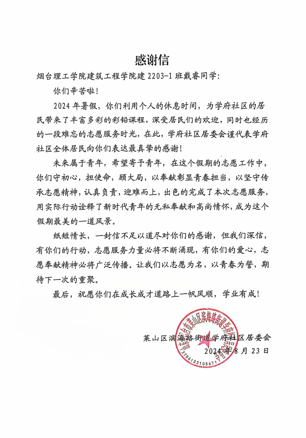 近期,太阳成集团tyc9728收到两封来自山东省烟台市莱山区的感谢信。信中,莱山区滨海路街道学府社区居委会高度赞扬了公司戴睿同学和石韵扬同学在假期利用个人休息时间,连续五个周末参与志愿服务为社区居民带来丰富多彩的彩铅课程中所展现出的青春担当和志愿服务精神,同时向公司培养优秀人才表示衷心的感谢。