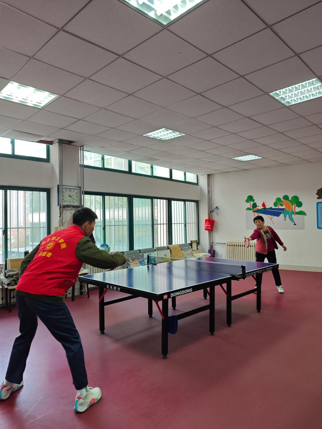 活动伊始,建2456-1班的同学们主动联系了小区照料中心的服务人员,详细了解了社区老人们的实际需求。随后,他们开展了一系列志愿服务活动,包括陪伴老年人散步、聊天以及参与各类社交活动,旨在减轻老人们的孤独感,并增强他们与社会的联系。在陪伴老人的过程中,同学们注意到小区内存在一些垃圾,于是迅速组织起来,对小区公共区域的垃圾进行了全面清理。经过大家的共同努力,社区的环境卫生得到了显著提升,卫生死角被一一清除,街道恢复了整洁与有序,垃圾分类工作也初见成效。活动接近尾声时,同学们还与老人们举行了一场别开生面的乒乓球友谊赛。赛场上,老员工志愿者和老人们全情投入,每一次挥拍都充满了力量与激情,比分交替上升,难分伯仲。这场比赛不仅是一场体育竞技,更是爱与温暖的传递,没有胜负之分,只有彼此的欢笑与关怀。