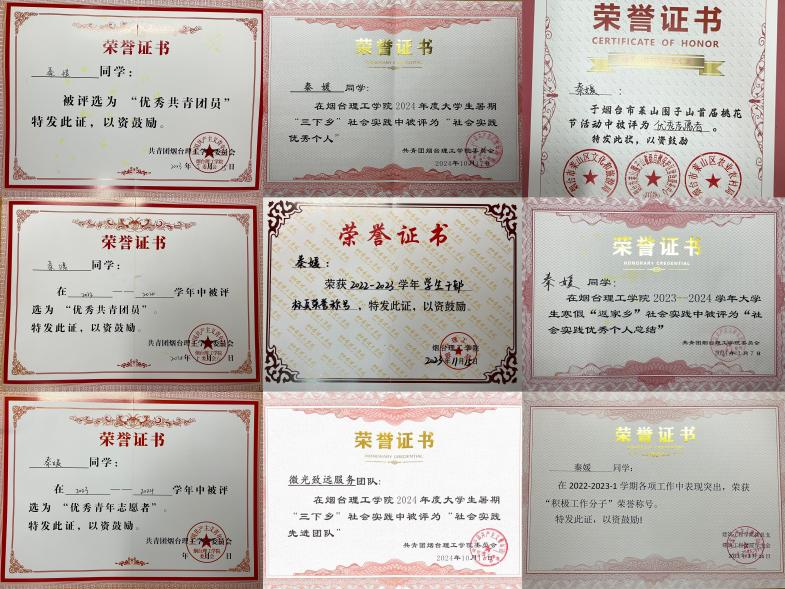 “纸上得来终觉浅,绝知此事要躬行”,作为新时代青年,在社会实践方面,积极响应百万老员工进社区投身于各个志愿服务活动,参与“烟台市莱山区围子山桃花节”、“烟台市广播电视台互联网志愿服务”“百万老员工进社区”等60余场志愿服务活动,在实践中获得“社会实践优秀个人”、“优秀个人总结”、“先进实践团队”、“优秀实践团队”以及“优秀团队实践报告”等荣誉。作为一名员工干部,她始终坚持全心全意为同学服务。在担任员工会主席期间,积极负责,不忘初心,对待工作高度负责,在2023-2024学年获校级优秀员工干部标兵荣誉称号。