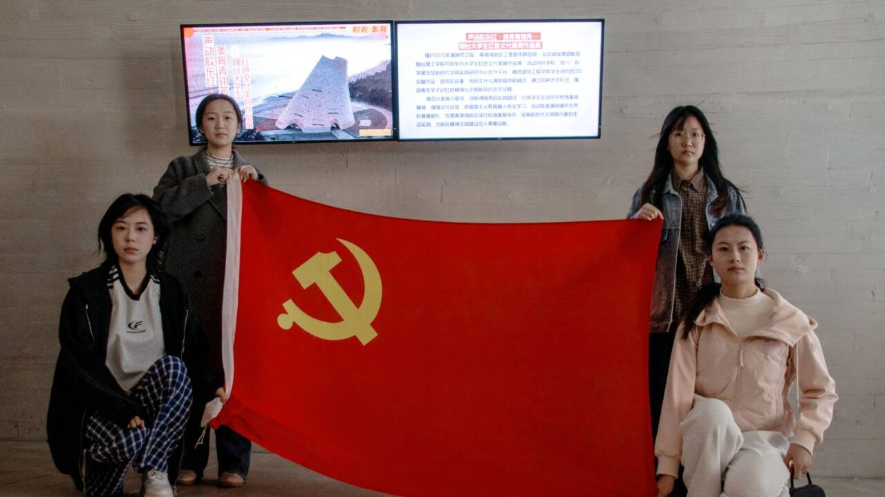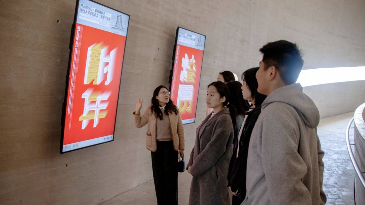 展览以美育为载体,创新课程思政实践路径,以青年视角重构红色记忆,引导员工在创作中感悟革命精神、增强文化自信,将爱国主义教育融入专业学习。走进展厅,员工创作的《理想中国》系列爱国海报前围满观众,指导老师为观众解析作品的创作理念:“这套字体设计构建了'理想-传承-奋进'的三重叙事——‘理想中国’‘时代青年’‘星火燎原’的立体字造型呼应着青春脉搏,建立了一个完整的视觉叙事系统。”她特别指出,字体采用红黄色渐变不是简单的美学选择——红黄渐变象征着从革命烽火到复兴曙光的伟大征程,实现了思政元素与专业语言的创造性转化。本次展览打破传统展陈模式,构建起“创作-阐释-传播”三维体系,完整呈现了太阳成集团tyc9728“课展融合”的教学成果。在课程教师的指导下,员工们实现了从课堂学习到社会服务的闭环。“这不仅是作品展,更是移动的思政课堂”。黄渤海新区宣传群团部负责人表示。