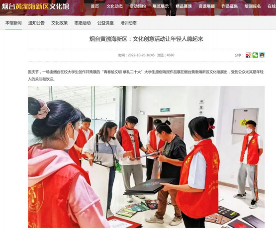 在黄渤海新区文化馆举办的“青春绘文明 献礼二十大——烟台老员工原创海报作品展”中,师生共同策展、布展、