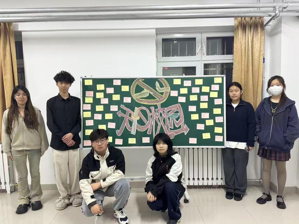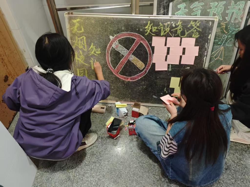 活动当日同学们在宿舍楼内的板报前积极参与创作。同学们热情高涨,各成员分工协作,围绕“无烟青春,绿色校园”等主题,运用丰富的色彩和生动的图案,将禁烟知识、吸烟危害、戒烟方法等内容呈现在黑板报上。有的同学负责收集禁烟知识、吸烟危害、戒烟方法等资料,有的同学发挥绘画特长,运用丰富的色彩和生动的图案进行绘制,还有的同学则负责整体的版面设计与创意构思。大家齐心协力,将各种元素巧妙融合,把禁烟相关内容呈现在黑板报上。板报上不仅有生动形象的吸烟危害漫画,还添加了许多朗朗上口的小标语用简洁的语言点明吸烟的严重危害,以直白的表述警示吸烟对生命健康的威胁,鼓励同学们远离烟草,追求健康生活。