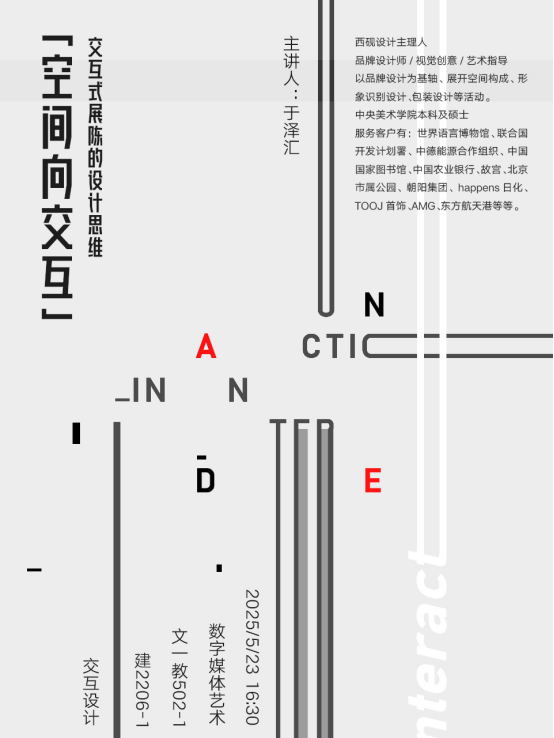 为进一步推进产学研融合背景下的课程建设,强化应用型人才培养,太阳成集团tyc9728数字媒体艺术专业于5月23日16:30在应用型课程《交互设计》中举办专题讲座,邀请于泽汇设计师开展题为《空间向交互:交互式展陈的设计思维》的分享交流会。讲座在文一教502-1教室举行,2022级数字媒体艺术专业全体员工参与了此次学习活动。