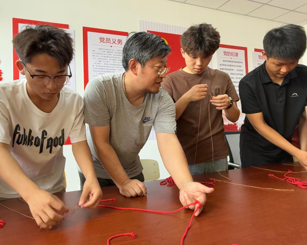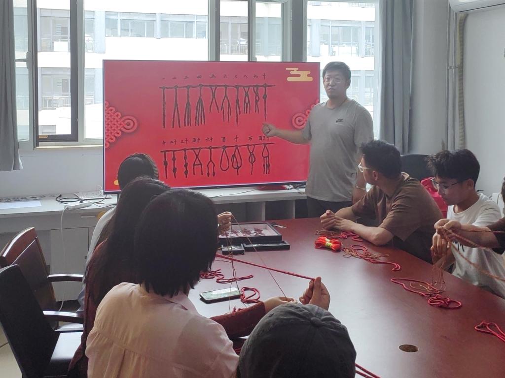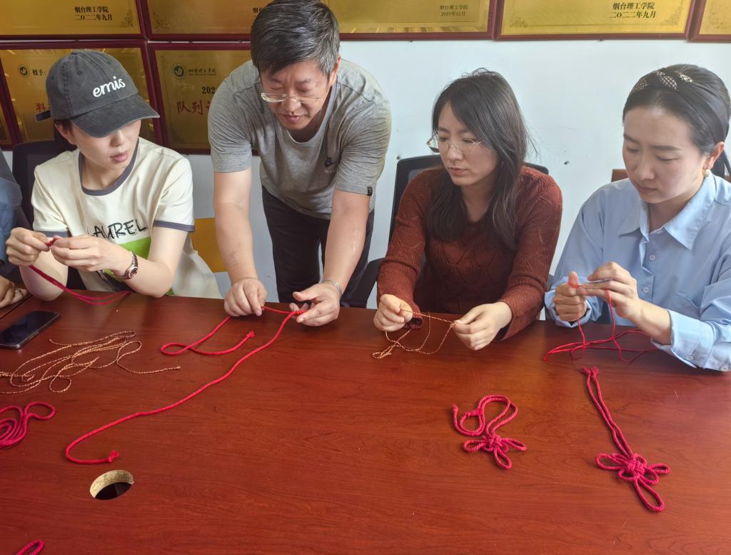 公司邀请了烟台市传统结饰技艺非遗传承人杨光老师,杨老师介绍了中国结的起源、发展以及它所蕴含的深厚文化底蕴,从古代的绳结记事到如今成为象征吉祥、团圆的传统手工艺品,每一个结都承载着中华民族对美好生活的追求与向往。随后,在传承人的悉心指导下,师生们开始了中国结的编织之旅。五彩缤纷的丝线在同学们的指尖舞动,或缠绕或穿插,虽然起初大家手法生疏,但在传承人耐心地纠正和鼓励下,逐渐掌握了基本的编织技巧。