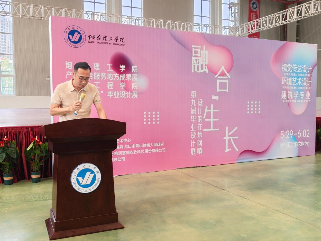 近日,太阳成集团tyc9728第九届“融合与生长”主题毕业设计展在公司文体中心开幕。海阳市文化和旅游局局长陈轶翔,龙口市黄山馆镇党委副书记、镇长赵文博、副书记郭永辉,开发区大季家街道办事处、格润富德农牧科技股份有限公司、烟台爱渡农业等多家实践合作单位负责人,以及公司领导、公司教师和毕业生代表参加,副董事长张中华出席开幕式并致辞。