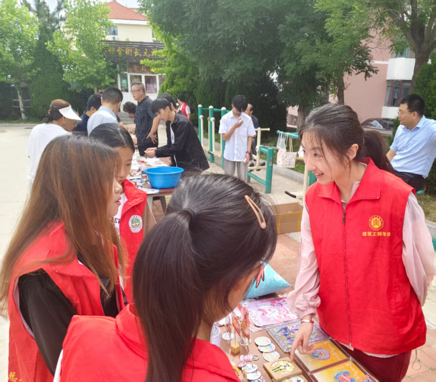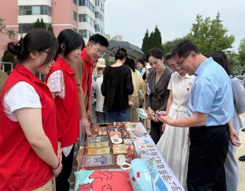 幸福集市共设置了多个特色区域,每个区域都人气满满,亮点纷呈。在公益义卖区,摆满了同学们精心制作的手工艺品、闲置书籍和特色文创产品。不少居民和师生穿梭其中,挑选心仪的物品,为公益事业贡献自己的一份力量。其中,非遗文化展示区成为本次活动的一大亮点,手工文创公益义卖品整齐陈列。员工志愿者身着红马甲,热情向居民介绍,居民们驻足挑选,在购物中践行公益,摊位前欢声笑语不断。