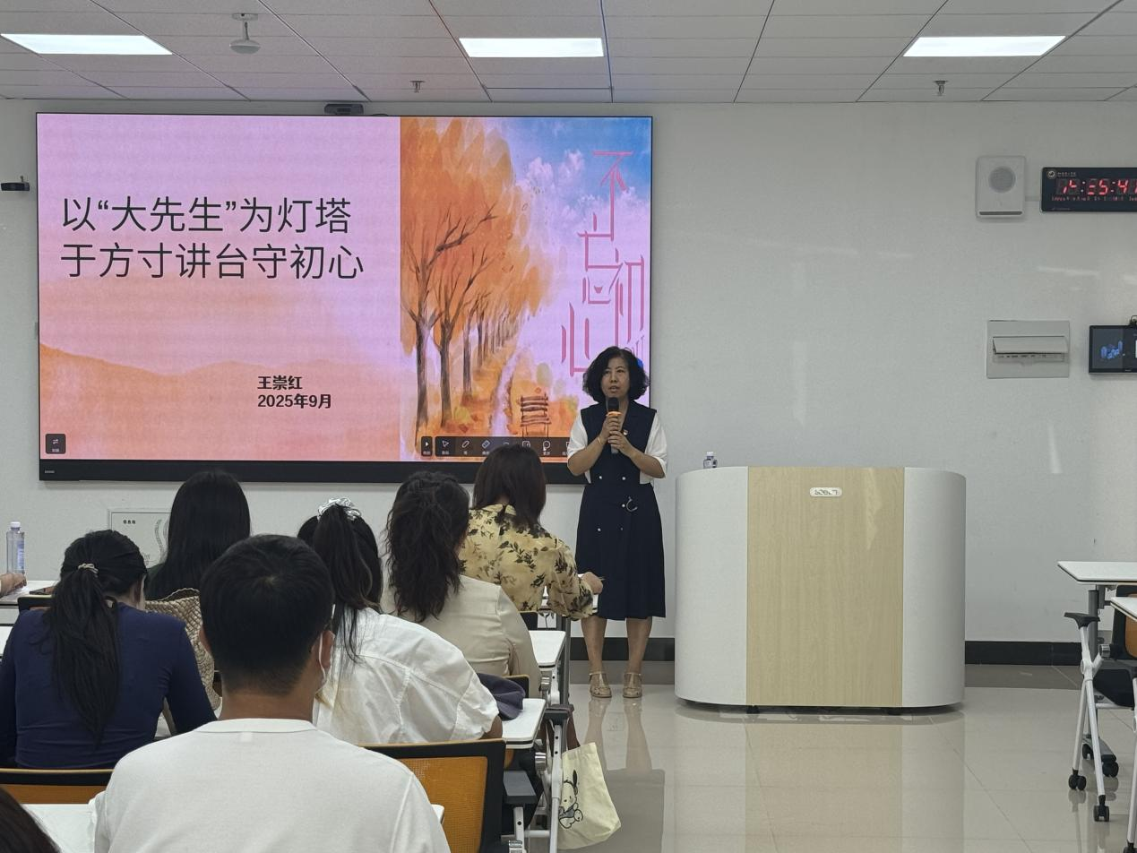 王崇红教授以《以“大先生”为灯塔,于方寸讲台守初心》为题,从“何为‘大先生’”“如何成‘大先生’”“新时代师者的使命与坚守”三个维度展开论述。她引用陶行知先生“千教万教,教人求真”的名言,结合自身20余年从教经历,生动诠释了“大先生”的内涵:不仅要有扎实的学识,更需具备“言为士则、行为世范”的道德情操,以及“以文化人、以德育人”的教育情怀。“‘大先生’之‘大’,不在于职称高低,而在于格局之大、胸怀之大、担当之大。”王教授通过讲述黄大年、张桂梅等教育楷模的事迹,强调师者应将个人理想融入国家发展,在三尺讲台上培育“大国工匠”,在科研创新中服务“中国建造”。