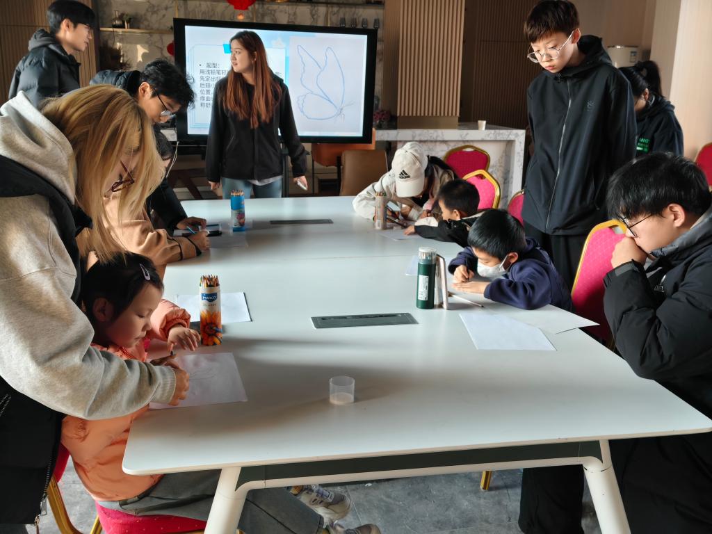 活动开始前,志愿者们提前布置好绘画场地,精心准备了彩铅、画纸、铅笔、橡皮等绘画工具,并通过提前查阅的蝴蝶科普资料,为参与者准备了生动易懂的讲解内容。课堂上,志愿者首先以图文结合的方式,向大家介绍了蝴蝶的外形特点——对称的翅膀、细长的触角、小巧的身体,还分享了彩铅绘画的基础技巧,如色彩搭配、明暗过渡、线条勾勒等。志愿者一边示范,一边手把手地指导大家下笔。