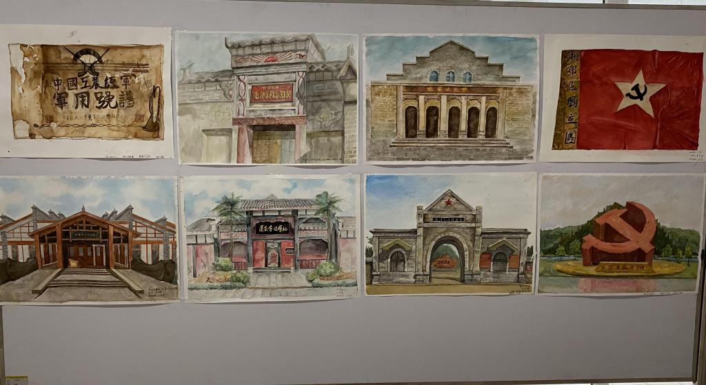 作品展出过程中吸引了大批同学前来参观,他们仔细品鉴着每一幅作品,沉醉在绘画作品之中。这些革命文物、党史上的重要会议旧址、革命烈士旧居、伟人旧居等形象,不仅带给了同学们强烈的视觉震撼和心灵震撼,也让参与作品创作的同学在创造作品中发挥出自己的爱国情感及创作潜力,使得此次课程教学充满了理想和信仰的力量。