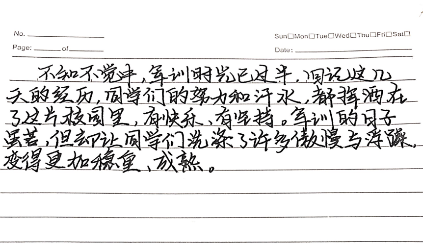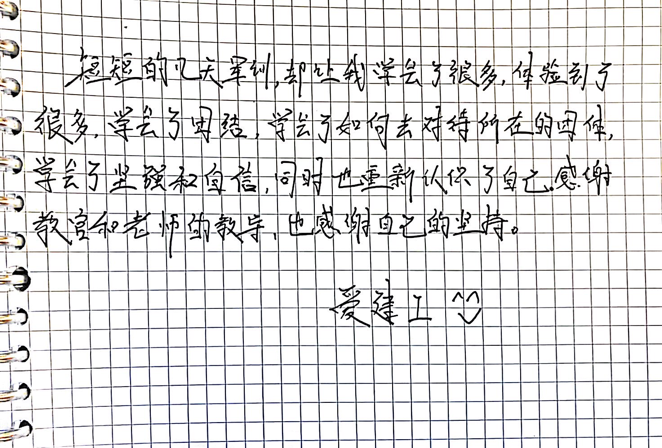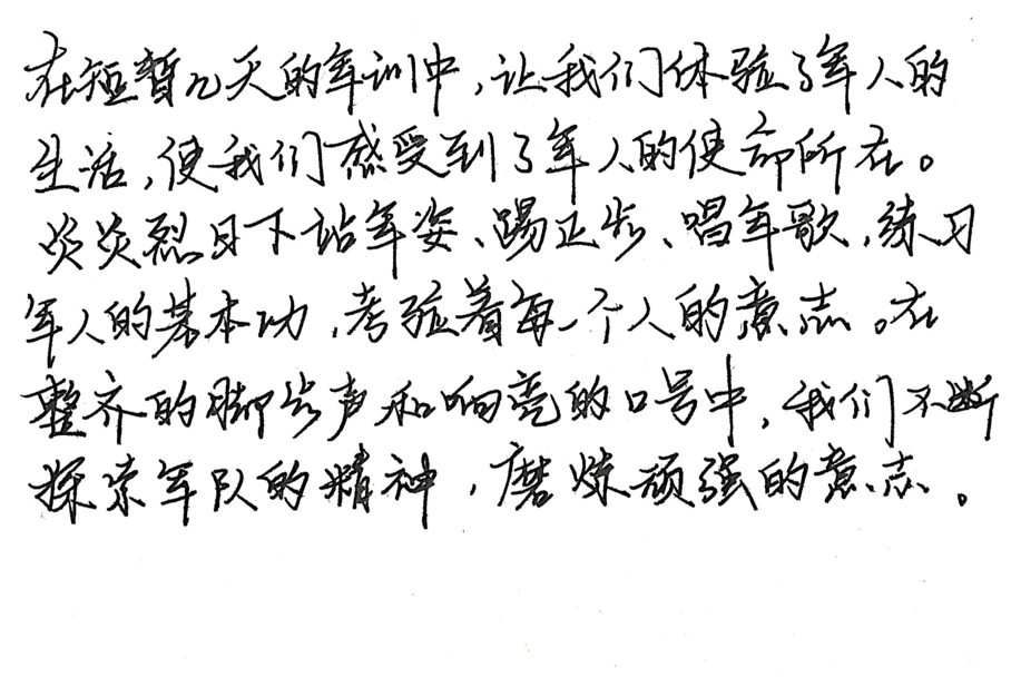 短短的几天军训,却让我学会了很多,体验到了很多,学会了团结,学会了如何去对待所在的团体,学会了坚强和自信,同时也重新认识了自己。感谢教官和老师的教导,也感谢自己的坚持。——张煜林