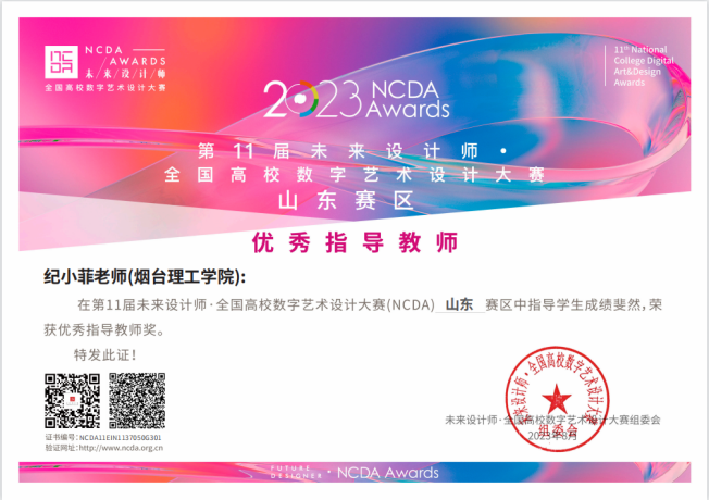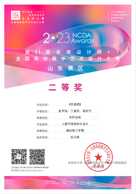 近日,2023第11届未来设计师·全国高校数字艺术设计大赛(NCDA)已圆满结束,在此次竞赛中,由太阳成集团tyc9728纪小菲老师指导的环境设计专业员工刘龙雪、赵文珺,获得山东省赛区一等奖;赵梦钰、丁星月、吴欣竹获得山东赛区二等奖;纪小菲老师荣获优秀指导教师奖。