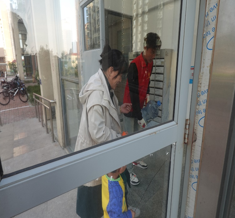 团员志愿者们在社区广场与老人们进行攀谈,关心老人的身体健康并帮助老人照顾这些可爱的小朋友,志愿者们与孩子们打成一片,欢声笑语,老人们对志愿者们十分赞扬并且十分期待我们再次来到社区,在牢记社区负责人的两方面之外,志愿者们看见社区居民提水回家时主动提出提水帮助,使得社区居民对我们大为赞赏。志愿者们虽然大汗淋漓,但是依然为这份志愿活动感到开心与自豪!