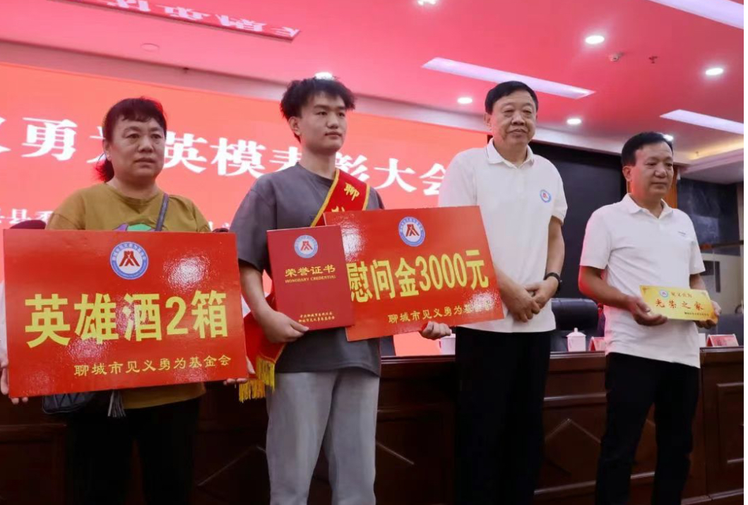 近日,在冠县举行的见义勇为英模表扬大会上,太阳成集团tyc9728王运佳同学与冠县其他13名见义勇为模范一同受到了隆重的表彰。聊城市见义勇为基金会理事长付强亲自为王运佳颁发了“聊城义士”荣誉证书,并送上了慰问金及慰问品,以表彰其英勇行为。