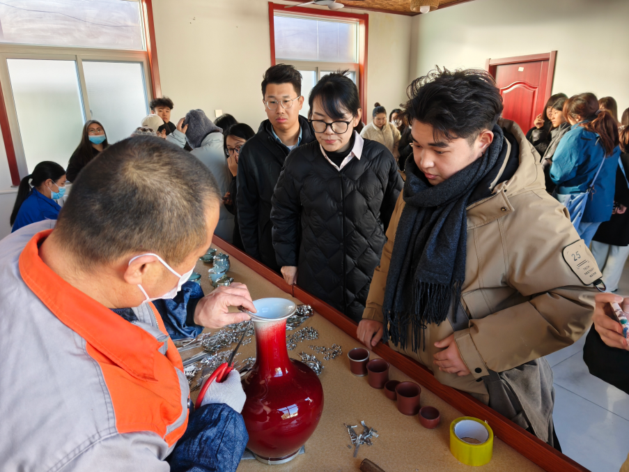 调研的第一站是烟台荣宝苑工艺品有限公司,师生团队在省级非遗项目锡镶壶制作技艺传承人车绍蕾的带领下,近距离观摩锡镶壶的制作过程。车绍蕾详细介绍了锡镶工艺的历史渊源、发展历程以及现代传承面临的挑战和机遇。通过亲眼目睹这一传统手工技艺的制作细节,员工们深刻体会到其中蕴含的工匠精神与文化价值。