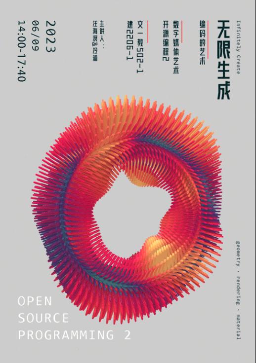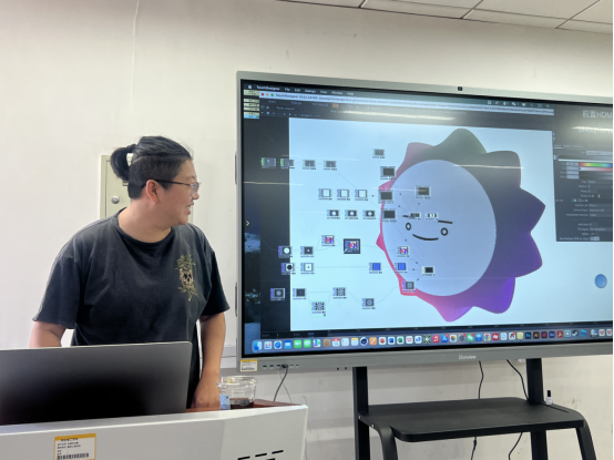 此课程由冷涵、汪海溟两位老师组成教学团队,共同带领数字媒体艺术专业22级员工开展了为期8周的课程学习及艺术创作。《开源编程2》采用的是程序代码编写、节点式程序模块互连,并结合表情互动与设备互动程序模块的方式来进行艺术内容的创造性设计。通过对案例分析与实践来学习了解编程语言的逻辑运用,并将其融入到动态艺术创作与设计之中。课程通过案例课程训练,将动态效果、音画效果与互动效果进行艺术化结合,作为《开源编程1》的进阶课程,目的在于培养员工在掌握进阶编程语言逻辑及不同开源平台操作方法的基础之上,融入自己的构想进行创意艺术生成。在应用型课程过程中锻炼员工逻辑思维的能力及审美鉴赏能力。