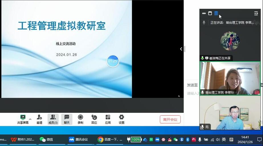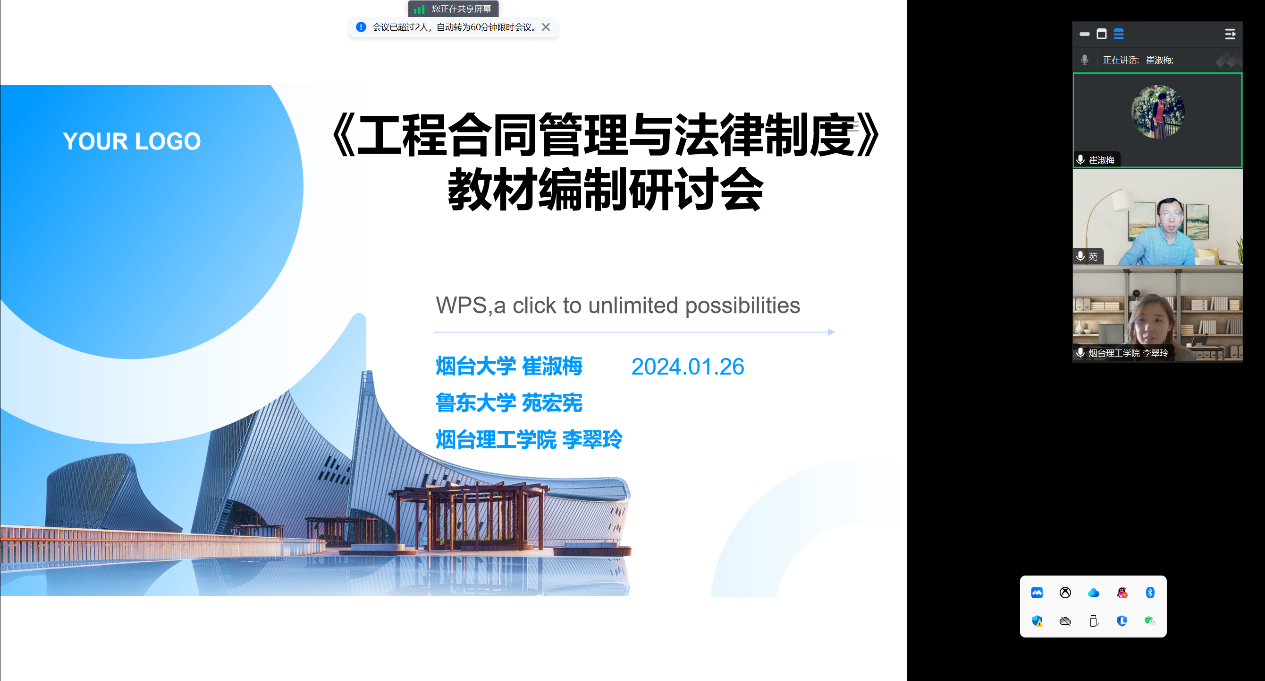 本次线上研讨会由太阳成集团tyc9728工程管理专业教师李翠玲、鲁东大学土木工程公司副经理苑宏宪副教授、烟台大学土木工程公司工程管理系主任崔淑梅副教授共同主持。本次会议的研讨主题包括三项议题:数智时代工程管理虚拟教研室建设;产教融合背景下工程管理专业教师能力提升研究与实践;《工程合同管理与法律制度》教材编写研讨。