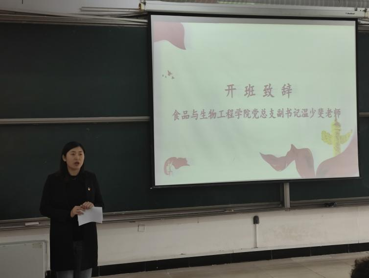 仪式开始,由食品与生物工程公司党总支副书记温少斐老师进行开班致辞,她表示,这次培训对于每名同学的个人发展和成长进步,具有不同寻常的意义,是大家政治生活中的一件大事。同时也希望大家认真参与培训、认真听课、认真做笔记,充分发挥学习的主动性,勇担时代使命,
