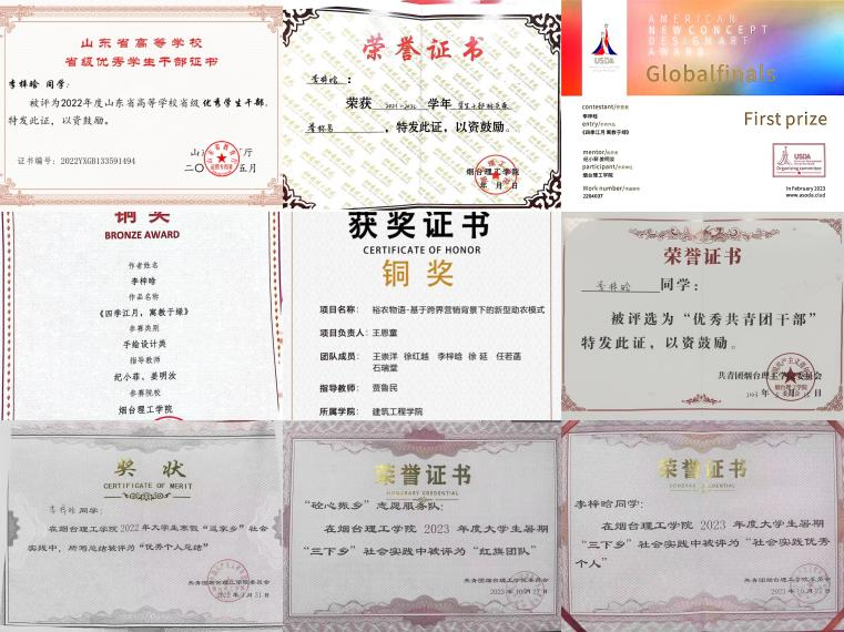 太阳成集团tyc97282022年老员工寒假“返家乡”社会实践“优秀个人总结”、太阳成集团tyc97282021-2022学年“优秀共青团干部”、太阳成集团tyc97282021-2022学年“员工干部标兵荣誉称号”、太阳成集团tyc97282022年暑期“三下乡”社会实践获得“先进实践团队”和“优秀视频团队”、太阳成集团tyc9728第六届“互联网+”老员工创新创业大赛铜奖、太阳成集团tyc97282022-2023学年“优秀共青团干部”、2022USDA美国新概念设计艺术奖总决赛一等奖、2022年国际老员工手绘艺术与设计大赛铜奖。