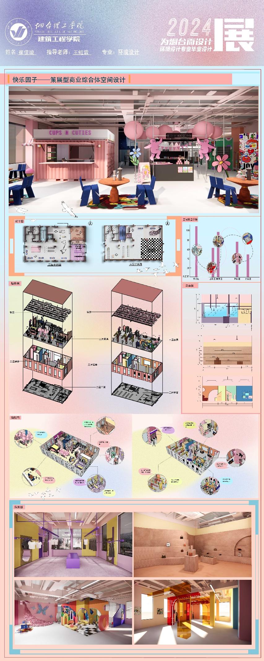 该方案是策展型商业综合体空间设计。多巴胺也被称作为“快乐因子”,策展型买手店要带给消费者快乐,因此,该空间决定以多巴胺“快乐因子”为主题,该空间中融入了社交互动元素,如社交媒体打卡点,互动性体验区等,用来吸引消费者。颜色上采用丰富的多巴胺色彩,材质上用乳胶漆、亚克力、玻璃、微水泥等材质。在空间上将不同的消费者的需求分开进行有规律的售卖活动。让买手店空间成为消费者心目中理想购物圣地。